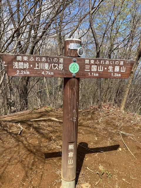 歩程4時間。国土地理院地図には記されていないが、井戸から軍刀利神社経由以外に、長泉寺の右手より尾根を登るルートをとっても熊倉山の山頂に立つことができる。